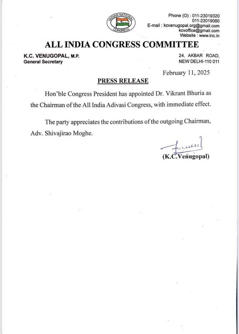 Dr.Vikrant Bhuria को तत्काल प्रभाव से अखिल भारतीय आदिवासी कांग्रेस का अध्यक्ष नियुक्त किया