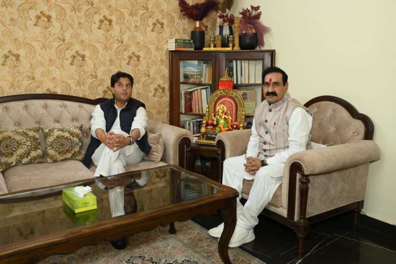 भोपाल । केंद्रीय संचार मंत्री और पूर्वोत्तर क्षेत्र विकास मंत्री श्री ज्योतिरादित्य सिंधिया ने आज राजधानी आगमन पर पूर्व गृह मंत्री डॉ नरोत्तम मिश्रा से निवास पर सौजन्य भेट की। श्री मिश्रा ने श्री सिंधिया का आत्मीय स्वागत किया। इस दौरान दोनों के बीच समसामायिक विषयो पर चर्चा हुई।