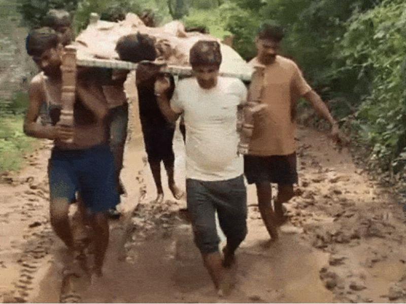 मैहर में बदहाल व्यवस्था: सड़क न होने के कारण एंबुलेंस नहीं पहुंची, ग्रामीणों ने खाट को बनाया स्ट्रेचर