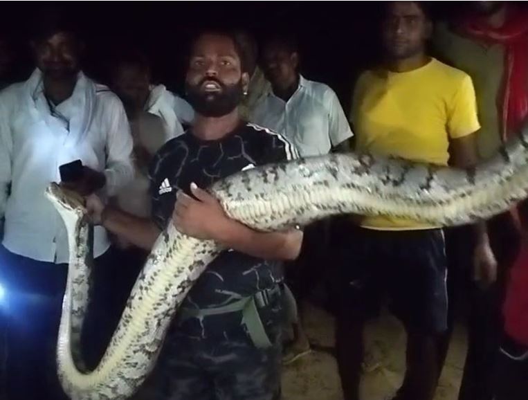 गांव वालों ने बताया कि धान के खेत में विशालकाय अजगर ने एक बकरी को निगल लिया। गांव वालों ने जब यह नजारा अपनी आंखों से देखा तो दंग रह गए। करीब 22 फीट लंबे इस अजगर का वजन 60 किलो से ज्यादा बताया जा रहा है। अचानक निकले इस अजगर को लेकर गांव के लोग घबराकर इधर-उधर भागने लगे। उन्होंने तुरंत इसकी सूचना नरवर निवासी सर्पमित्र सलमान पठान को दी। रात करीब 10 बजे पठान मौके पर पहुंचे और आधे घंटे की कड़ी मशक्कत के बाद अजगर को खेत से बाहर निकाला।