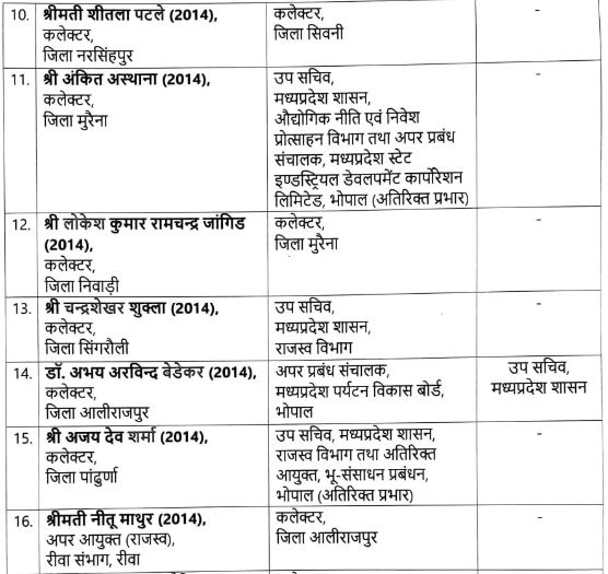 भोपाल। मध्य प्रदेश की मोहन सरकार ने मंगलवार को बड़ी संख्या में आईएएस अधिकारियों को इधर से उधर किया। भारतीय प्रशासनिक सेवा के 24 अधिकारियों को नई जिम्मेदारी सौंपी गई है। इसमें 12 जिलों के कलेक्टर को हटा दिया गया है। इसमें भिंड में विधायक से भिड़ने वाले कलेक्टर संजीव श्रीवास्तव को लोक निर्माण विभाग में अपर सचिव बनाया गया है। वहीं, आईएएस बनने के 14 साल बाद पहली बार कलेक्टर बनीं नेहा मारव्या सिंह को भी हटा कर विमुक्त घुमन्तु एवं अर्धघुमन्तु जनजाति विभाग का संचालक बनाया गया है।