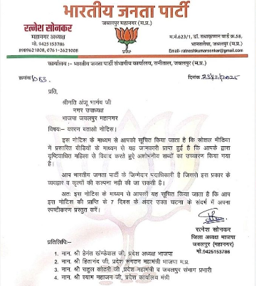 महिला सम्मान पर सवाल: BJP नेत्री को पार्टी नोटिस, 7 दिन का अल्टीमेटम