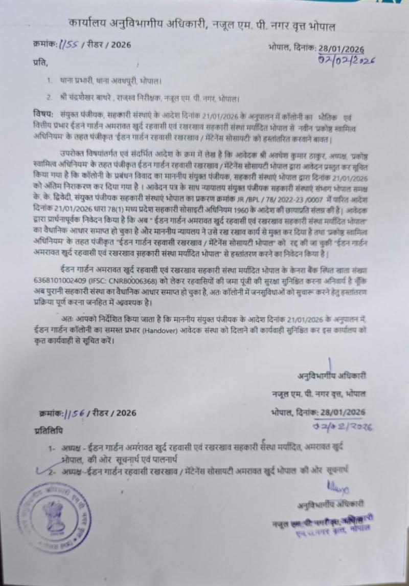 भोपाल । अमरावत खुर्द स्थित ईडन गार्डन कॉलोनी इन दिनों गंभीर प्रशासनिक विवाद का केंद्र बनी हुई है। कॉलोनी के रहवासियों का आरोप है कि वैधानिक रूप से गठित प्रबंधन संस्था को अब तक प्रभार नहीं सौंपा गया, जिससे बुनियादी विकास कार्य प्रभावित हो रहे हैं। जानकारी के अनुसार, अनुविभागीय अधिकारी (एसडीएम) एम.पी. नगर द्वारा ‘म.प्र. प्रकोष्ठ स्वामित्व अधिनियम, 2000’ के तहत कॉलोनी के रख-रखाव के लिए एक वैधानिक मेंटेनेंस संस्था का गठन किया गया। यह संस्था शासन द्वारा राजपत्र (गजट) में अधिसूचित और अधिकृत बताई जा रही है।