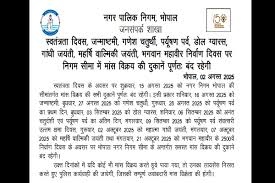 भोपाल नगर पालिक निगम द्वारा जारी आदेश में लिखा गया है कि चैती चांद, रामनवमी, महावीर जयंती, बुद्ध जयंती पर निगम सीमा में मांस विक्रय की दुकानें पूर्णतः बंद रहेगी. आदेश में आगे लिखा है कि चैती चांद के अवसर पर शुक्रवार, 20 मार्च 2026 को नगर निगम भोपाल की सीमांतर्गत मांस विक्रय की सभी दुकानें पूर्णतः बंद रहेंगी. इसी प्रकार शुक्रवार, 27 मार्च 2026 को रामनवमी, मंगलवार, 31 मार्च 2026 महावीर जयंती तथा शुक्रवार, 01 मई 2026 को बुद्ध जयंती के अवसर पर भोपाल नगर निगम सीमा के अन्तर्गत समस्त मांस विक्रय की दुकाने बंद रहेंगी.उक्त दिनांकों में यदि कोई भी मांस विक्रय करते हुये पाया गया, तो उसका लायसेंस निरस्त करते हुए पुलिस कार्यवाही की जावेगी, जिसकी सम्पूर्ण जवाबदारी मांस विक्रेता की होगी।
