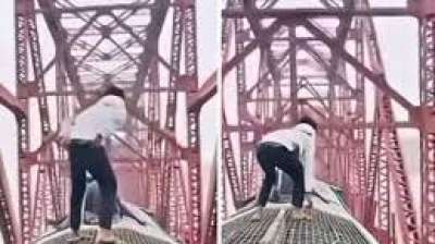 नई दिल्ली । एक बांग्लादेशी युवक ने चलती ट्रेन के ऊपर चढ़कर स्टंट किए। इस दौरान रास्ते में एक पुल भी आय़ा। वो बैरियर आने पर बैठ गया और फिर...