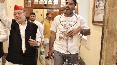 सपा विधायक हाथ पैरों में जंजीर पहनकर प्रदर्शन किया